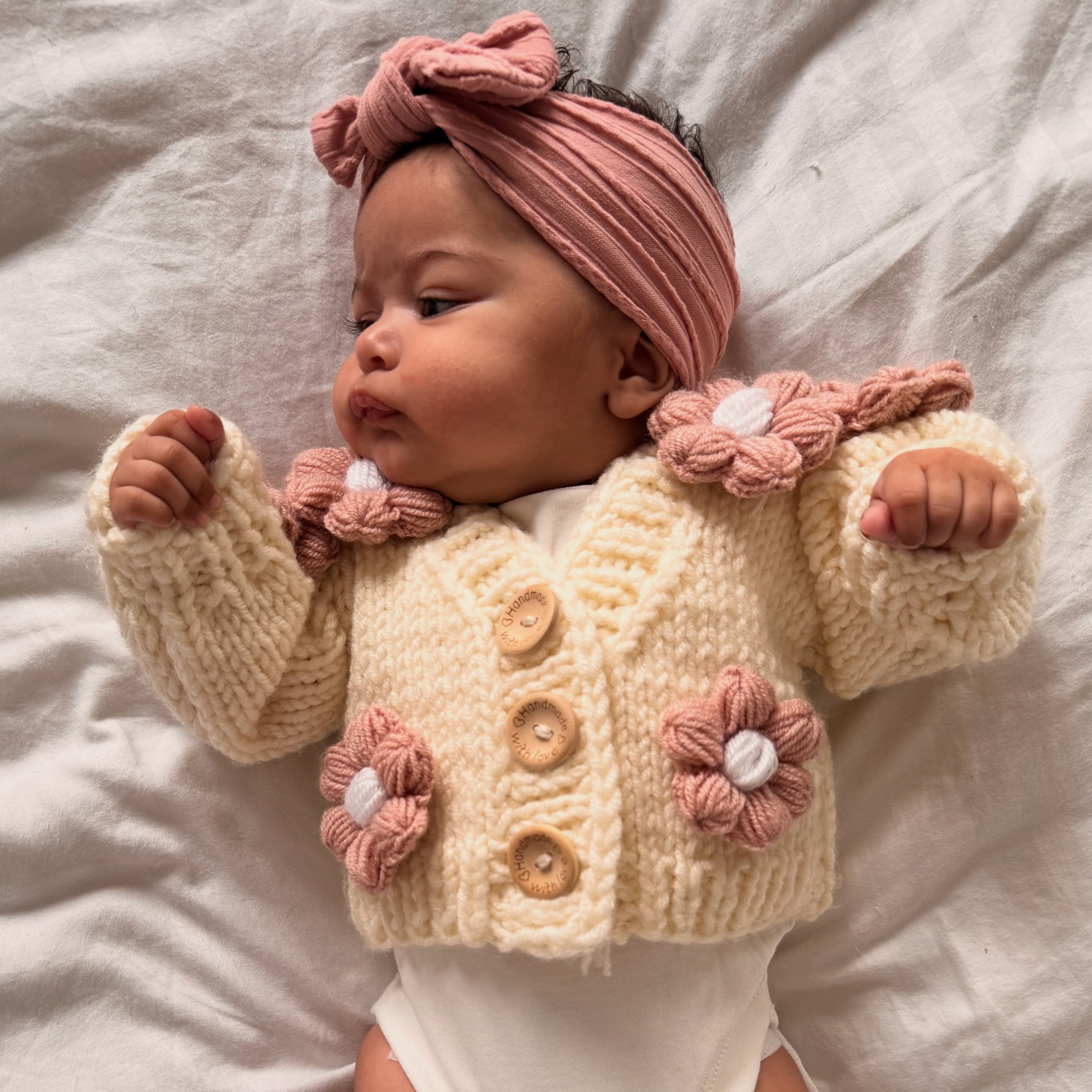 Our Cable Knit Bow Headbands are a must-have for your little one’s wardrobe. They pair perfectly with our Hand Knitted cardigans. Made from soft nylon, the stretchy material ensures a comfortable fit for newborns up to 3 years old. They are extremely gentle on delicate heads. A perfect girl gift that will last for years.