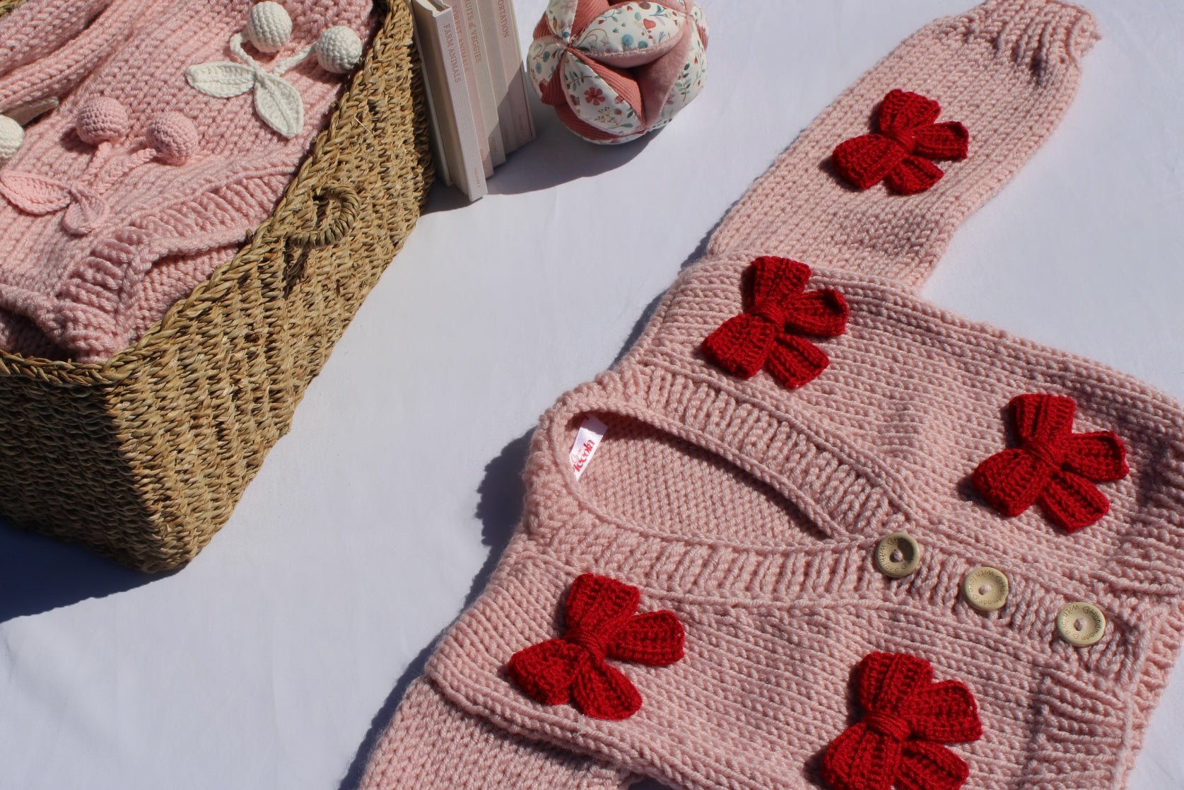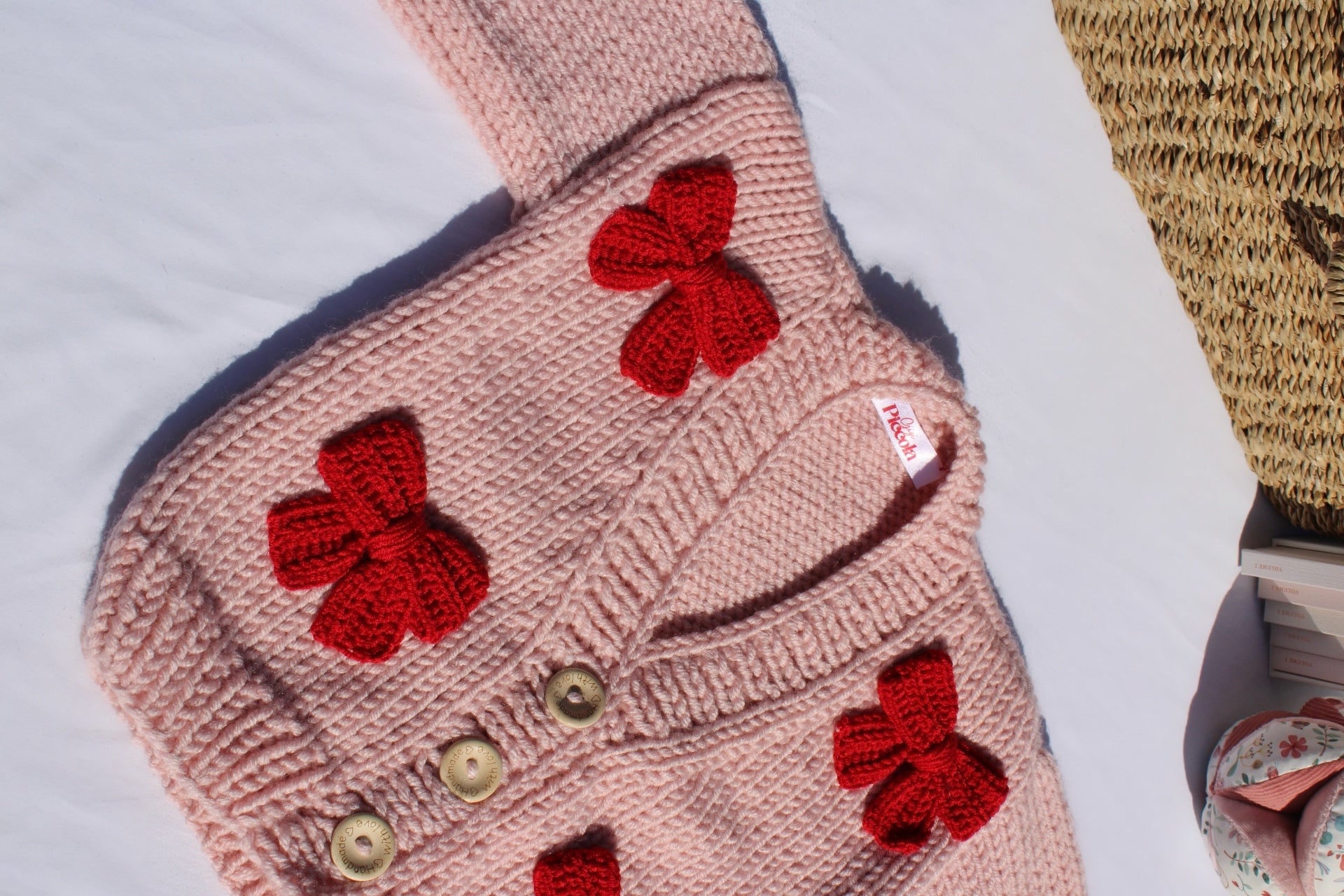 Our gorgeous Pink Bow cardigan, an essential for those autumn and winter days and perfect for the festive season.